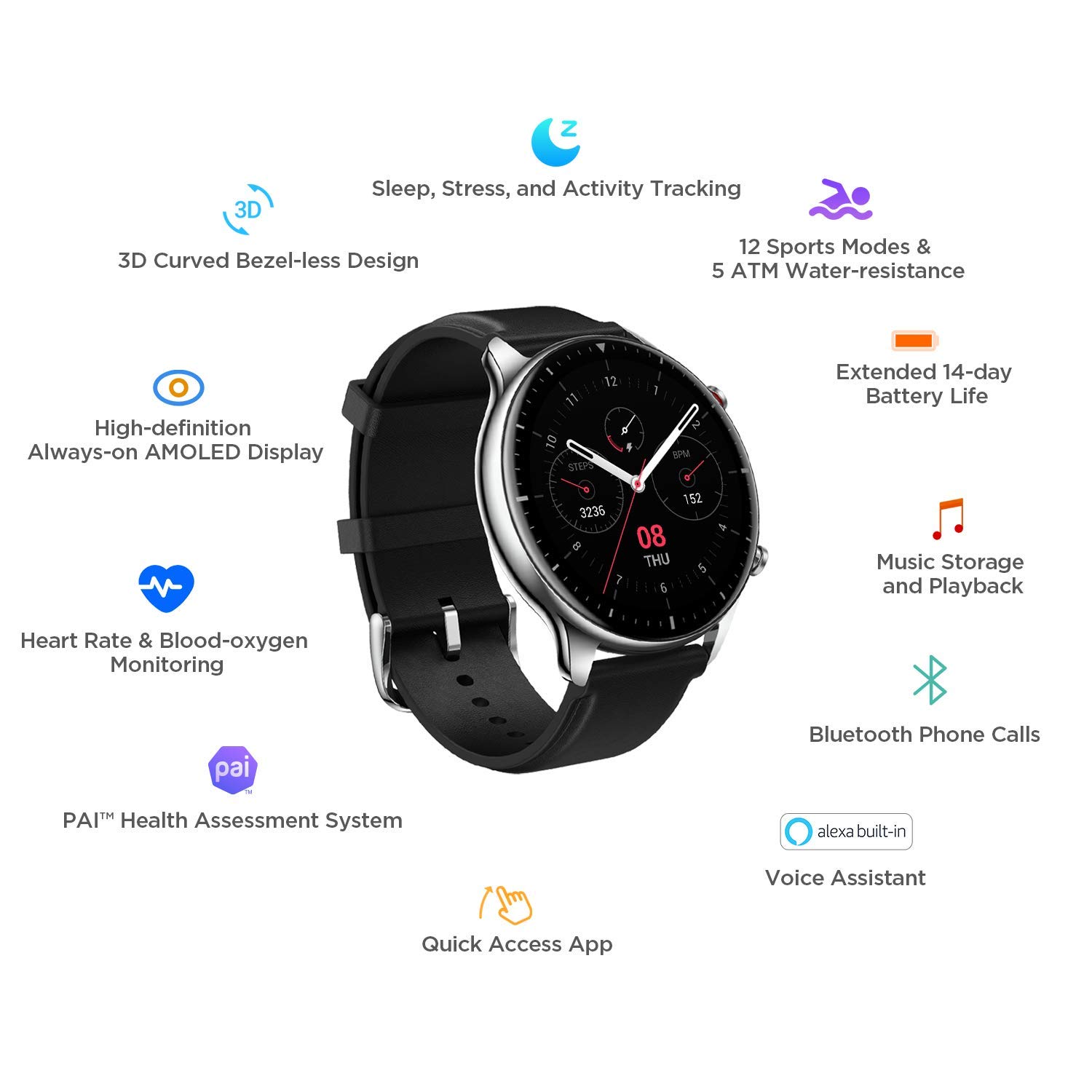 - YOUR SMART ASSISTANT: The Amazfit GTR 2 can proficiently handle your personal agendas – notify you of incoming calls or texts, provide sedentary reminders, Do Not Disturb, stopwatch and weather forecast functions, as well as enable the setting of alarms and timers.