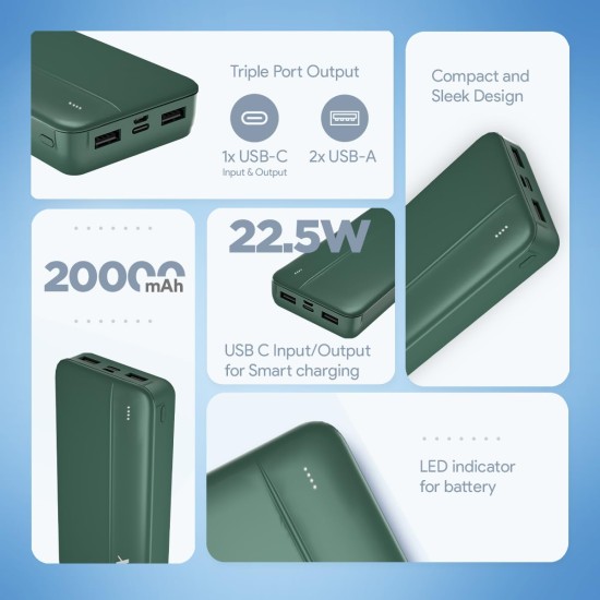 FLiX(Beetel) Just Launched UltraCharge 20,000mAh QCPD Power Bank,USB C/B Input,Tripple Output 22.5W Power Delivery,Compatible to iPhone 14 13 12 11 Samsung S22 S23 Google Pixel7 Oneplus – Olive Green (Open Box)