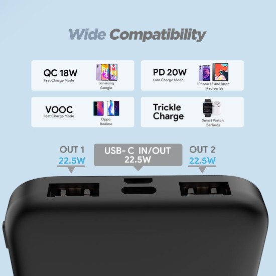 - ✅ [Lightning-Fast Charging] With a powerful 22.5W Quick Charge Power Delivery output, our power bank ensures lightning-fast charging for your devices. Say goodbye to long waiting times and enjoy swift power backup that keeps up with your fast-paced lifestyle. LED indicators provide clear status updates on the power bank’s charge level.
