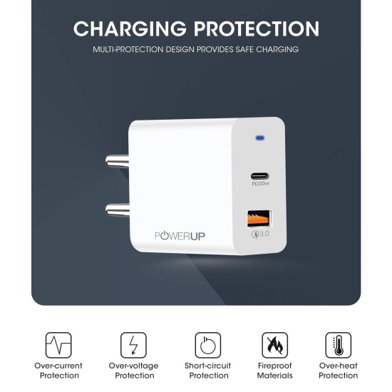 POWERUP Turbo Max Dual Port 20W PD Type-C & USB-A QC 3.0 Fast Charging Wall Charging Adapter for Smartphones/Tablet with BIS Certified in-Built Auto-Detect Technology (Sealed)